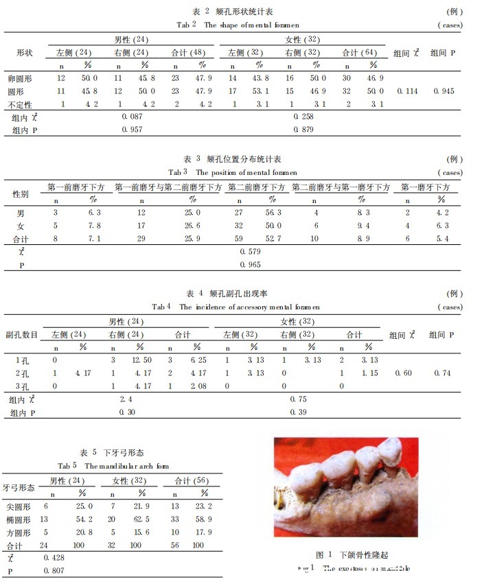 无论男性还是女性颏孔位于第二前磨牙下方居多性别之间颏孔位置分布无统计学差异(P>0.05)。颏孔副孔的出现男性标本中3例1个副孔、2例1个副孔、1例3个副孔;女性标本中2例1个副孔、1例2个副孔、未见3个副孔。左右侧分布及性别之间无统计学差异(P>0.05)。