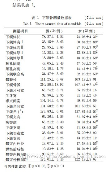 测量项目、测量方法主要依据《人体骨骼测量方法》(吴汝康1965年)及《人体测量手册》(邵象清1985年)。用上海量具刃具厂生产的0~360°游标万能角度尺(精确到5′)测量下颌角其余项目用桂林广陆数字测控股份有限公司生产的细尖爪数显卡尺(精确到0.01mm)集中时间进行测量。每个样本测量3次取其平均值。数据以x﹣±s表示所有的数据都经过SPS13.0进行统计组间数据比较采用方差分析或检验。